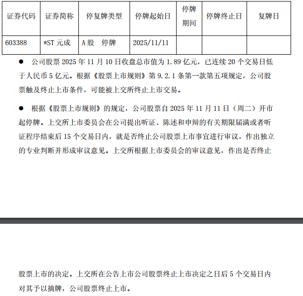 新华财经北京11月10日电(王媛媛) *ST元成(维权)11月10日晚间发布公告,公司股票已连续20个交易日在上海证券交易所的每日股票收盘总市值均低于5亿元,触及交易类强制退市指标。公司股票自2025年11月11日开市起停牌。