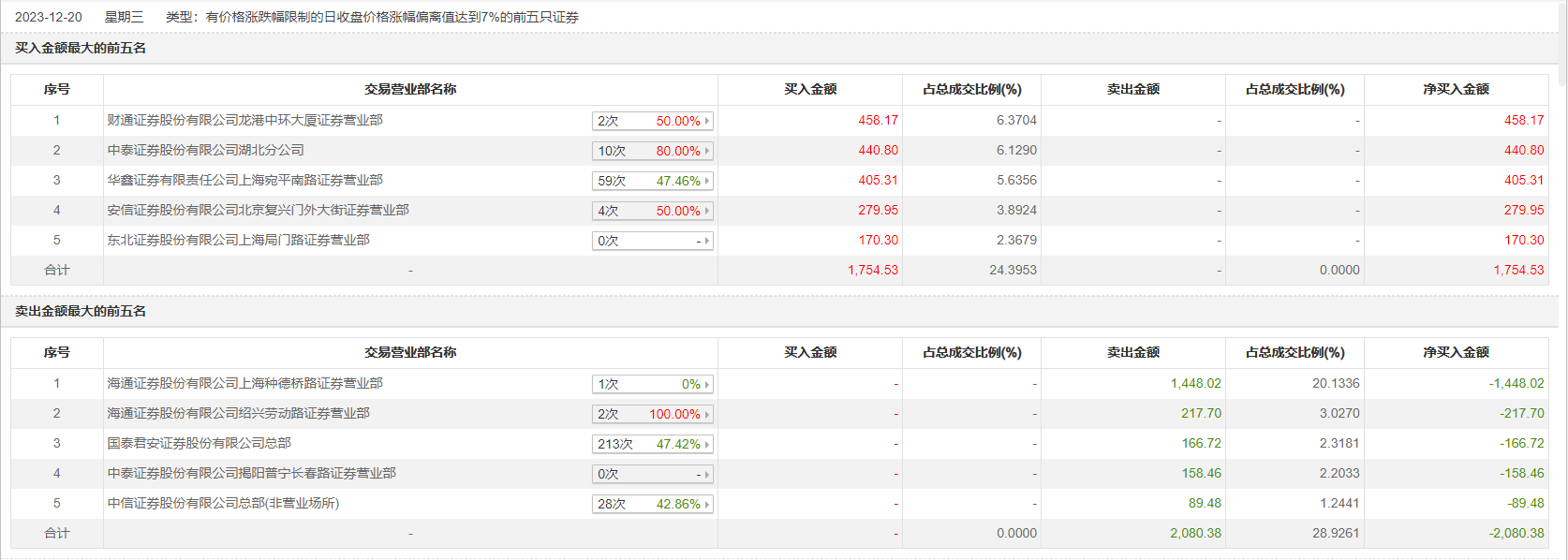 12月20日,亚振家居今日涨停,龙虎榜数据显示,上榜营业部席位全天成交3834.91万元,占当日总成交金额比例为53.32%。其中,买入金额为1754.53万元,卖出金额为2080.38万元,合计净卖出325.86万元。