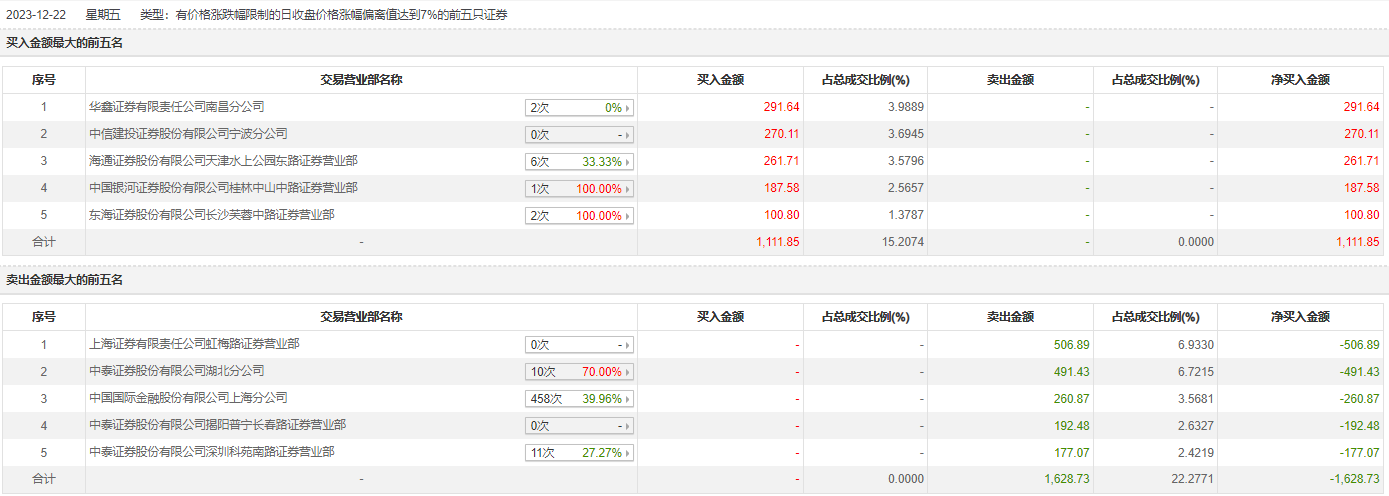 亚振家居12月22日涨停,全天换手率达3.18%,振幅达2.14%。龙虎榜数据显示,营业部席位合计净卖出516.89万元。其中,华鑫证券南昌分公司、中信建投证券宁波分公司分别买入291.64万元、270.11万元;上海证券虹梅路证券营业部、中泰证券湖北分公司分别卖出506.89万元、491.43万元。