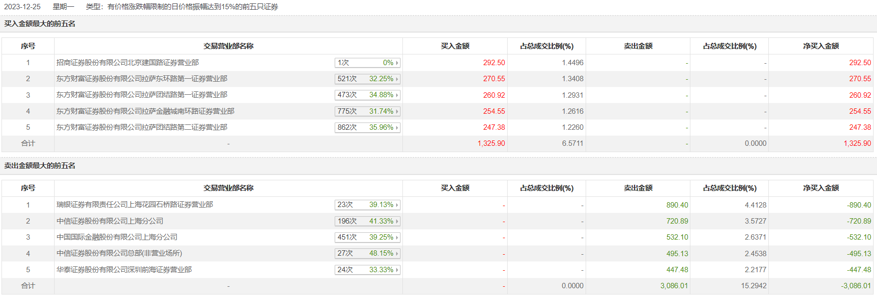 亚振家居12月25日跌停,全天换手率达9.43%,振幅达17.83%。龙虎榜数据显示,营业部席位合计净卖出1760.1万元。其中,瑞银证券上海花园石桥路证券营业部、中信证券上海分公司分别卖出890.40万元、720.89万元;招商证券北京建国路证券营业部、东方财富证券拉萨东环路第一证券营业部分别买入292.50万元、270.55万元。