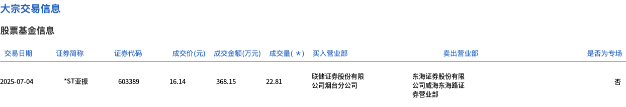 *ST亚振今日大宗交易折价成交22.81万股,成交额368.15万元