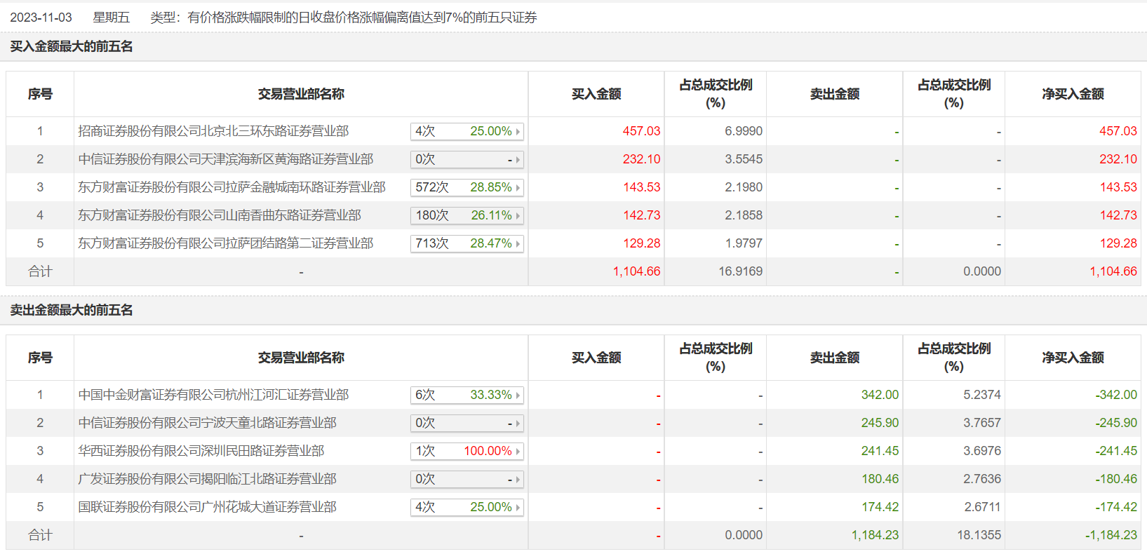 通达电气11月3日涨停,全天换手率达1.63%,振幅达0%。龙虎榜数据显示,营业部席位合计净卖出79.57万元。其中,招商证券北京北三环东路证券营业部、中信证券天津滨海新区黄海路证券营业部分别买入457.03万元、232.10万元;中国中金财富证券有限公司杭州江河汇证券营业部、中信证券宁波天童北路证券营业部分别卖出342.00万元、245.90万元。