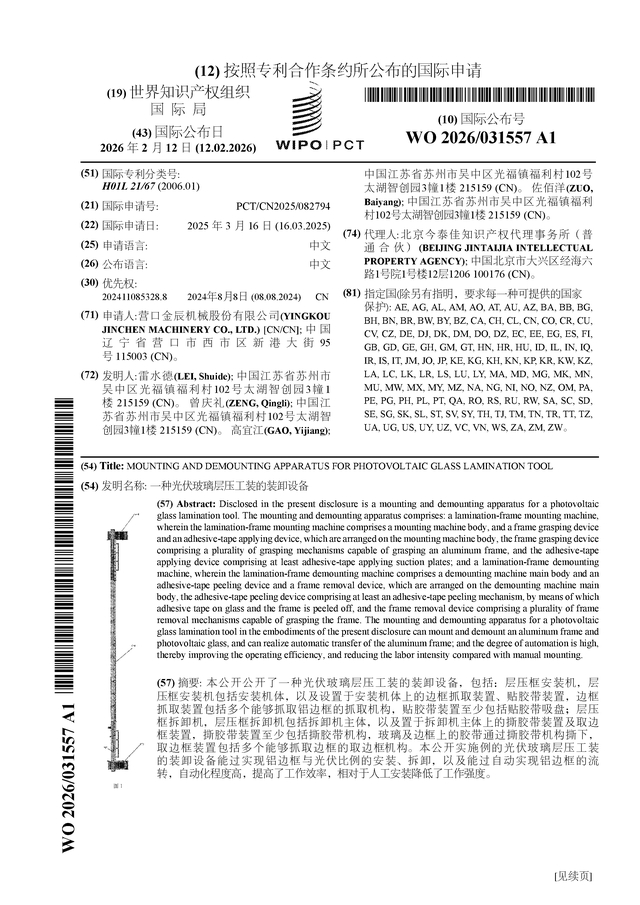 金辰股份公布国际专利申请:“一种光伏玻璃层压工装的装卸设备”