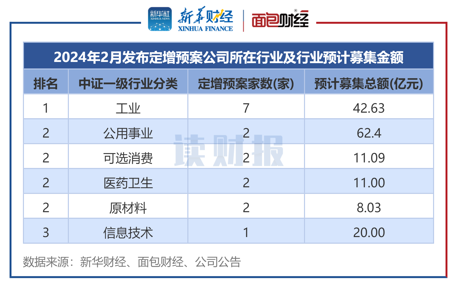 图6:2024年2月发布定增预案公司数(按中证行业分类)【读财报】是由新华财经与面包财经共同打造的一档以上市公司财报解读为主要内容的栏目。新华财经是新华社承建的国家金融信息平台,内容全面覆盖全球股市、汇市和债市等金融市场,提供权威、专业、全面的金融信息服务。