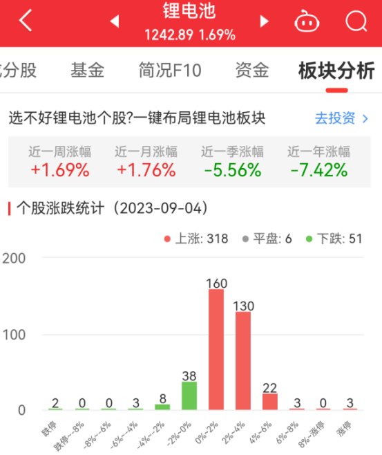 中国经济网北京9月4日讯今日,锂电池板块整体涨幅1.69%,其中318只股票上涨,6只股票平盘,51只股票下跌。