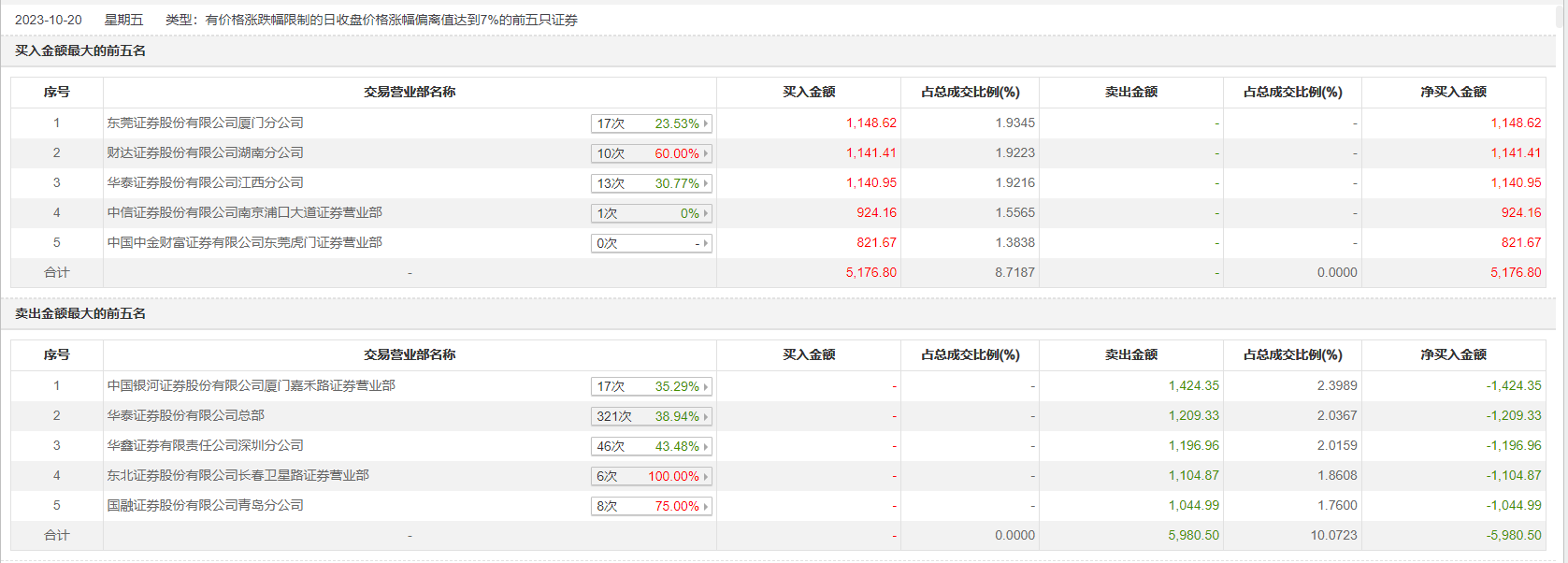 10月20日,吉翔股份今日涨停,全天换手率达10.51%,振幅达9.92%。龙虎榜数据显示,营业部席位合计净卖出803.69万元。其中,东莞证券厦门分公司、财达证券湖南分公司分别买入1148.62万元、1141.41万元;中国银河证券厦门嘉禾路证券营业部、华泰证券总部分别卖出1424.35万元、1209.33万元。