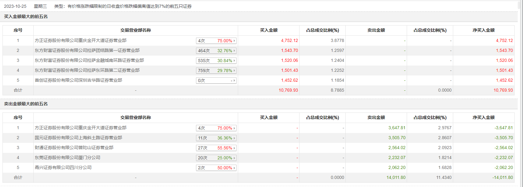 10月25日,吉翔股份今日跌停,全天换手率达19.74%,振幅达7.88%。龙虎榜数据显示,营业部席位合计净卖出3241.86万元。其中,方正证券重庆金开大道证券营业部、国元证券上海斜土路证券营业部分别卖出3647.81万元、3505.70万元;方正证券重庆金开大道证券营业部、东方财富证券拉萨团结路第一证券营业部分别买入4752.12万元、1543.70万元。