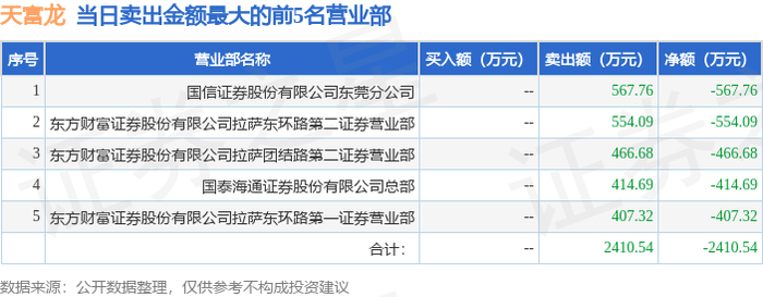 证券之星消息,沪深交易所2025年10月16日公布的交易公开信息显示,天富龙(603406)因有价格涨跌幅限制的日换手率达到20%的前五只证券登上龙虎榜。此次是近5个交易日内第2次上榜。