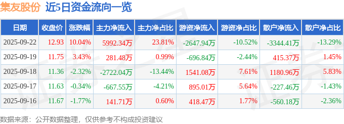 9月22日的资金流向数据方面,主力资金净流入5992.34万元,占总成交额23.81%,游资资金净流出2647.94万元,占总成交额10.52%,散户资金净流出3344.41万元,占总成交额13.29%。