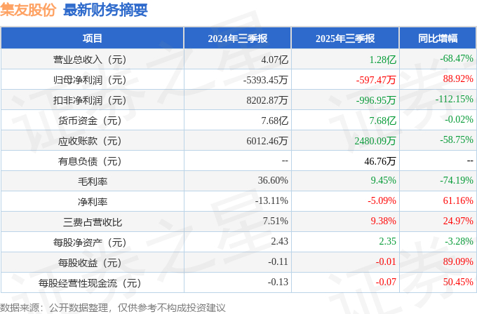 据证券之星公开数据整理,近期集友股份(603429)发布2025年三季报。根据财报显示,集友股份亏损收窄。截至本报告期末,公司营业总收入1.28亿元,同比下降68.47%,归母净利润-597.47万元,同比上升88.92%。按单季度数据看,第三季度营业总收入2427.43万元,同比下降80.22%,第三季度归母净利润-458.75万元,同比下降130.14%。
