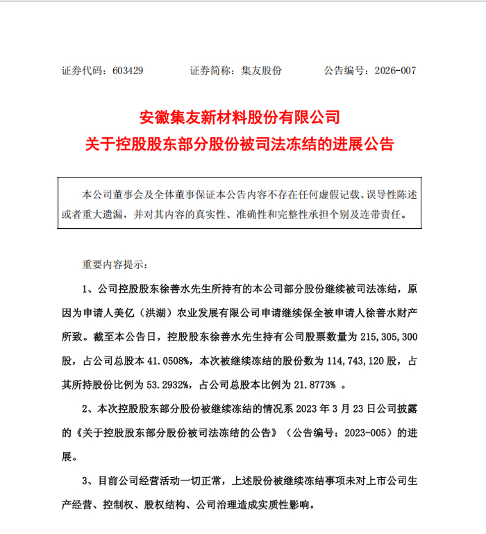 集友股份表示,目前公司经营活动一切正常,上述股份被继续冻结事项未对上市公司生产经营、控制权、股权结构、公司治理造成实质性影响。