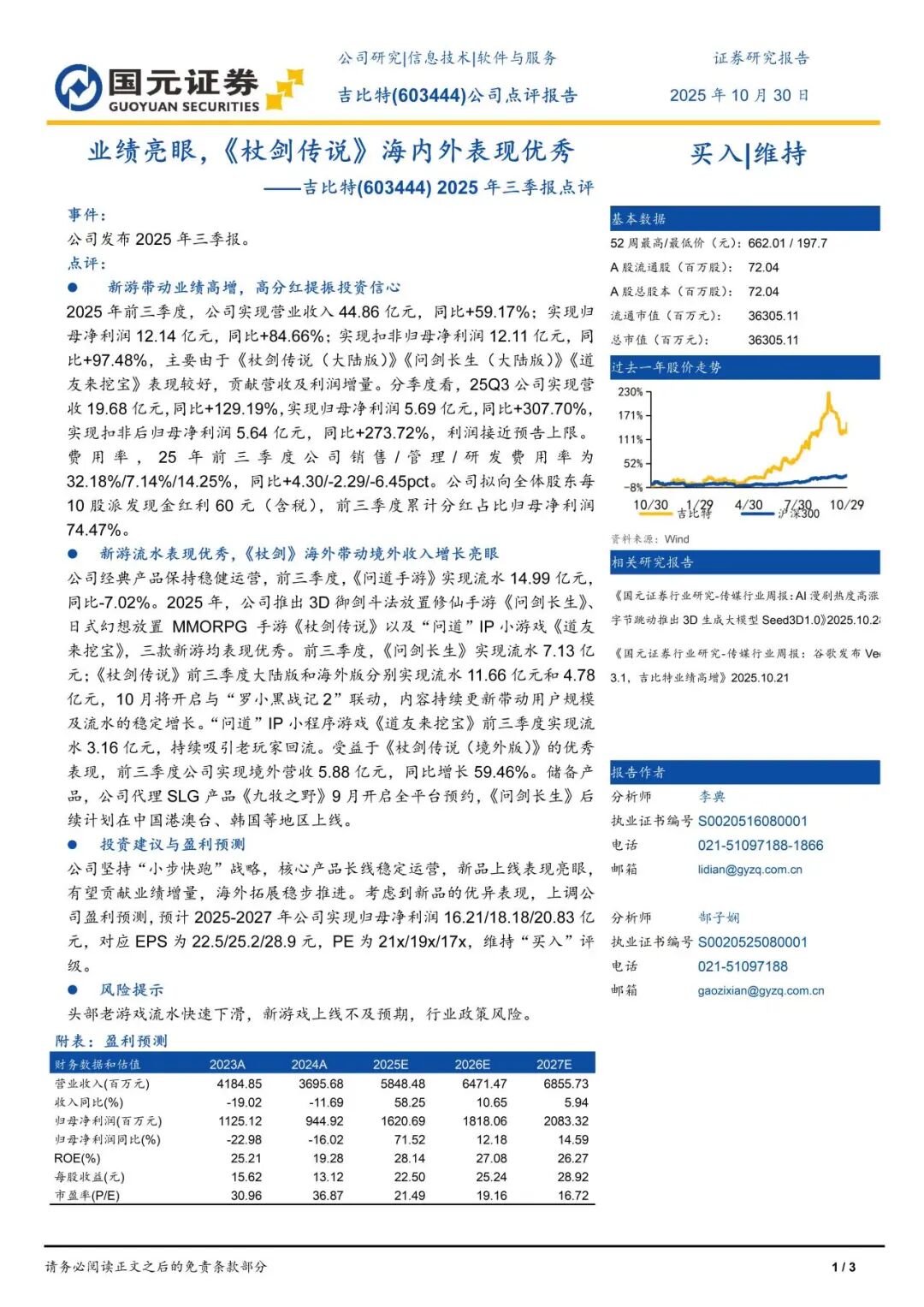 本报告摘自国元证券2025年10月30日已发布的《业绩亮眼,《杖剑传说》海内外表现优秀——吉比特(603444) 2025年三季报点评》,具体报告及分析内容请详见报告。若因对报告的摘编等产生歧义,应以报告发布当日的完整内容为准。