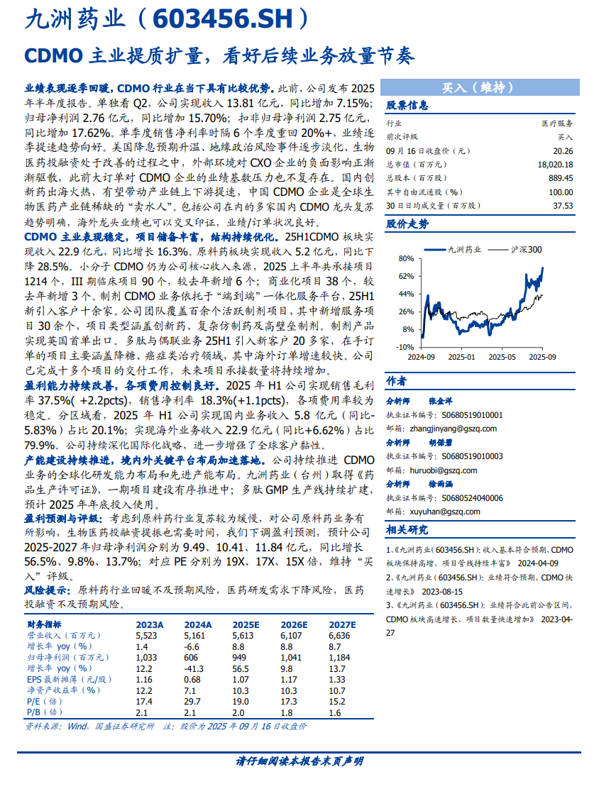 本文节选自国盛证券研究所于2025年9月18日发布的报告《九洲药业(603456.SH):CDMO主业提质扩量,看好后续业务放量节奏》,具体内容详见相关报告。