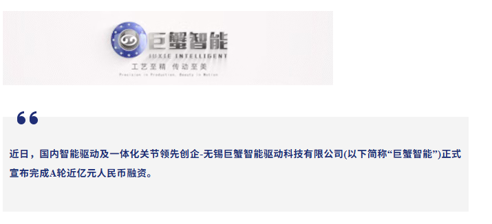 近日,无锡巨蟹智能驱动科技有限公司(以下简称“巨蟹智能”)宣布完成A轮近亿元人民币融资,由科沃斯战投领投,上海宁玮仁、上海湖银等具备产业资源的机构跟投。基于本次融资资金,巨蟹智能将进一步加大在一体化关节、高性能伺服系统、新兴传感器融合、先进运动规划算法等前沿技术的研发投入;扩充产能,建设新的一体化关节自动化生产线,提升规模化交付能力;拓展全球化市场生态建设。