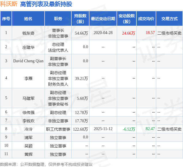科沃斯的高管列表及最新持股情况如下: