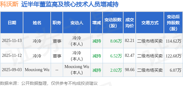 证券之星消息,根据11月14日市场公开信息、上市公司公告及交易所披露数据整理,科沃斯(603486)最新董监高及相关人员股份变动情况:2025年11月13日公司董事冷泠共减持公司股份8.06万股,占公司总股本为0.0139%。变动期间公司股价上涨0.65%,11月13日当日收盘报82.33元。