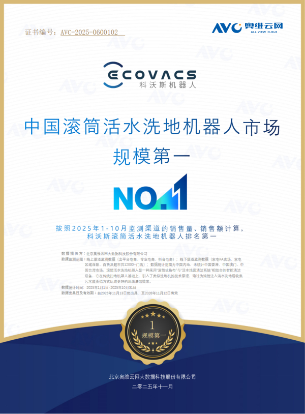 近日奥维云网(AVC)发布权威认证,2025年1-10月监测数据显示:科沃斯滚筒活水洗地机器人以91.9%销量占比、91.5%销售额占比的绝对优势,斩获中国滚筒活水洗地机器人市场规模第一。这也意味着,在当前热门的滚筒活水洗地机器人市场中,平均每卖出10台就有超过9台来自科沃斯。