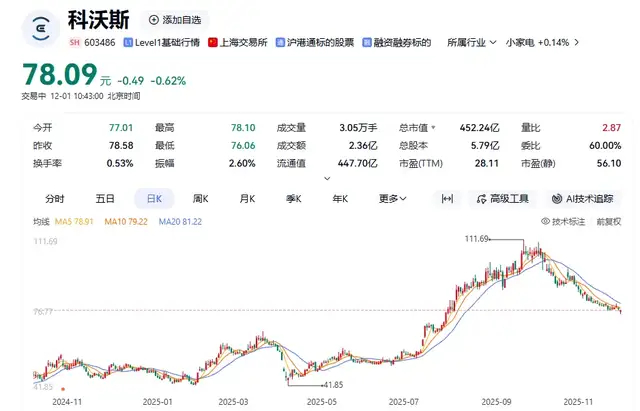 资本市场方面,科沃斯股价在2021年7月15日创下上市以来最高点252.71元/股后,持续调整,于2024年2月6日触及阶段低点27.76元/股。近期,其股价随大盘有所回升,截至12月1日10:43收于78.09元/股。
