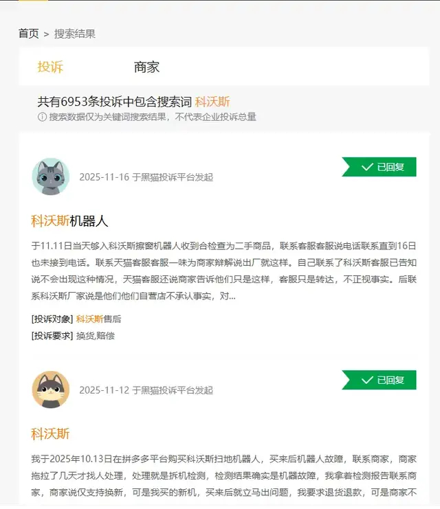 有消费者11月12日在黑猫投诉平台上投诉称,其于10月13日在电商平台购入一款科沃斯扫地机器人,收货后发现产品存在故障,在取得商家售后出具的故障鉴定报告后提出退货退款诉求,却遭拒绝。消费者不仅要求商家履行退货退款义务,还主张对涉事商家予以处罚等。