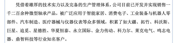 目前,公司已开发并实现销售一千二百余种微型轴承产品,被广泛应用于智能家居、消费电子、工业装备与机器人零部件、汽车制造、医疗器械与仪器仪表等众多领域,积累了如大疆、拓竹、科沃斯、巨星、追觅、星德胜、华夏恒泰、永立国际、金力传动、科力尔、莱克电气、鸣志电器、鼎智科技等行业知名客户。