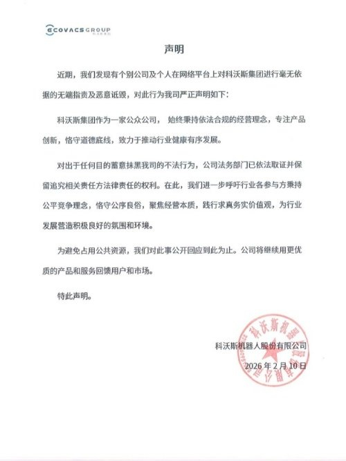科沃斯方面表示,对出于任何目的蓄意抹黑科沃斯的不法行为,公司法务部门已依法取证并保留追究相关责任方法律责任的权利,并呼吁行业各参与方秉持公平竞争理念,恪守公序良俗,聚焦经营本质,践行求真务实价值观,为行业发展营造积极良好的氛围和环境。