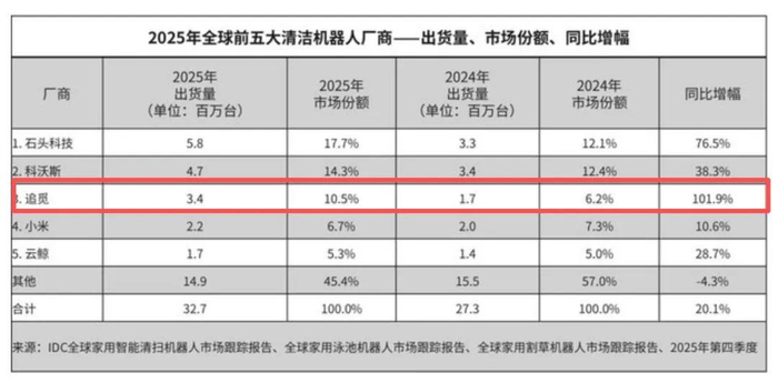 更让科沃斯寝食难安的是追觅的步步紧逼。追觅不仅在全球出货量上实现了高达101.9%的恐怖增速,更在2025年下半年以14.4%的市场份额反超科沃斯。这不仅是一组冰冷的数据,更是市场份额的实质性易主。
