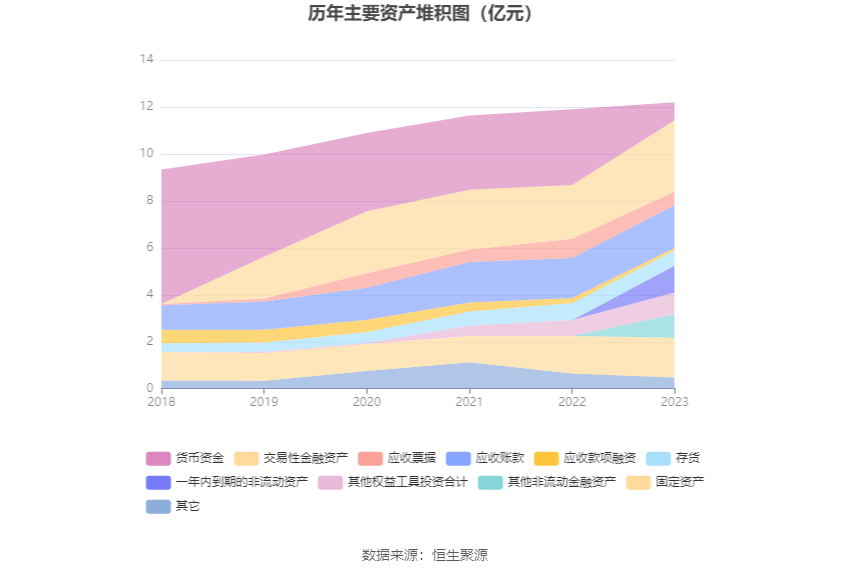 资产重大变化方面,截至2023年年末,公司货币资金较上年末减少76.53%,占公司总资产比重下降20.83个百分点;交易性金融资产较上年末增加32.82%,占公司总资产比重上升5.71个百分点;应收票据较上年末减少28.83%,占公司总资产比重下降2.09个百分点;其他权益工具投资合计较上年末增加36.37%,占公司总资产比重上升1.91个百分点。