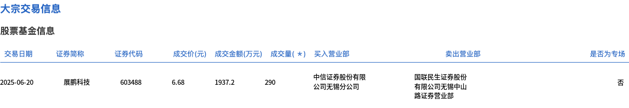 展鹏科技今日大宗交易折价成交290万股,成交额1937.2万元