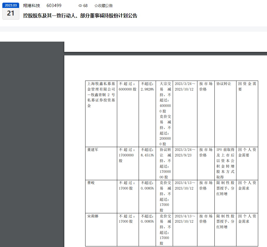 3月20日晚,翔港科技(603499.SH)发布控股股东及其一致行动人、部分董事减持计划。