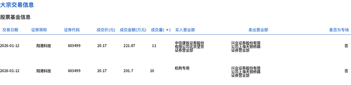 1月12日,翔港科技大宗交易成交21万股,成交额423.57万元,占当日总成交额的1.85%,成交价20.17元,较市场收盘价22.83元折价11.65%。