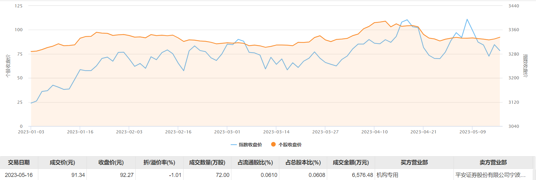 5月16日大宗交易成交72万股,成交额6576.48万元,占当日总成交额的6.15%,成交价91.34元,较市场收盘价92.27元折价1.01%。