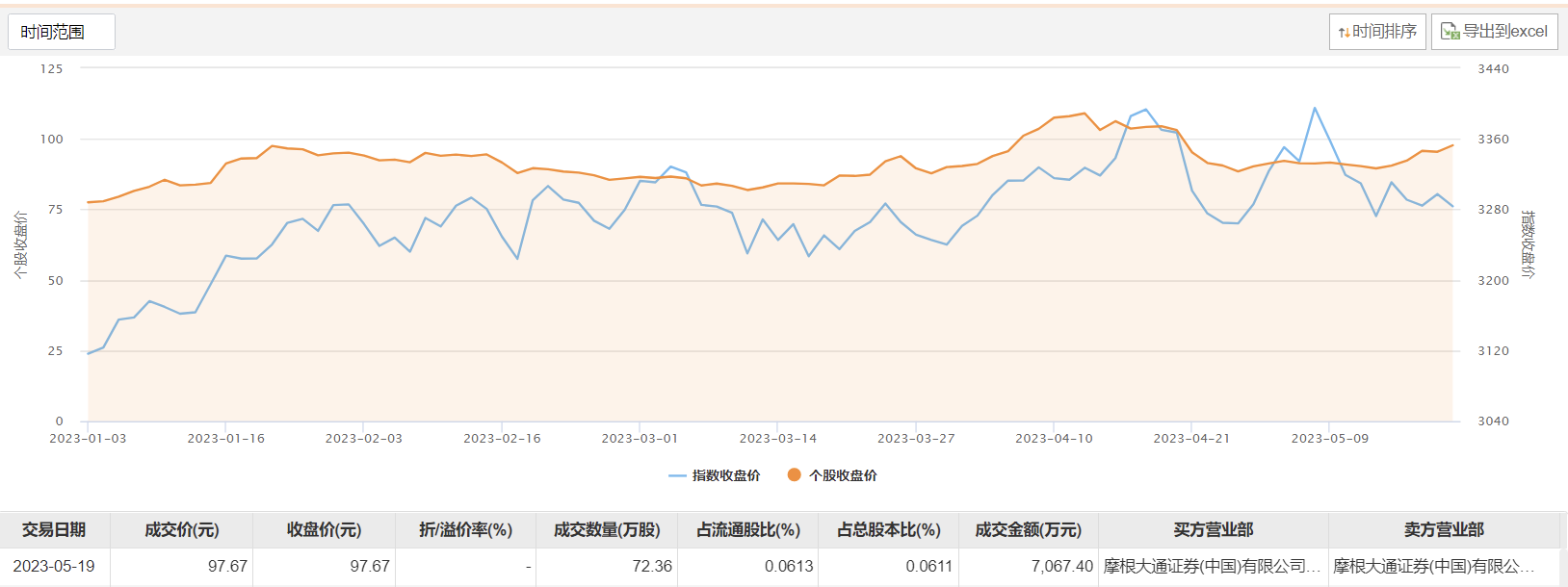 大宗交易成交72.36万股,成交额7067.4万元,占当日总成交额的5.3%,成交价97.67元,较市场收盘价97.67元持平。