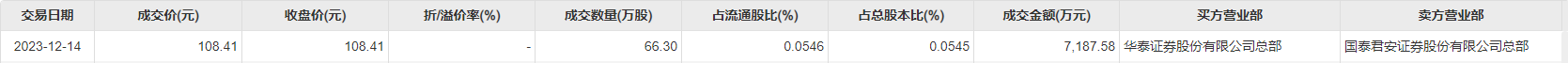 今日大宗交易成交66.3万股,成交额7187.58万元,占当日总成交额的9.44%,成交价108.41元,较市场收盘价持平。