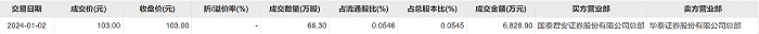 今日大宗交易成交66.3万股,成交额6828.9万元,占当日总成交额的7.2%,成交价103元,较市场收盘价持平。