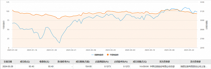 5月28日大宗交易成交154.6万股,成交额1.44亿元,占当日总成交额的14.3%,成交价93.4元,较市场收盘价93.4元持平。