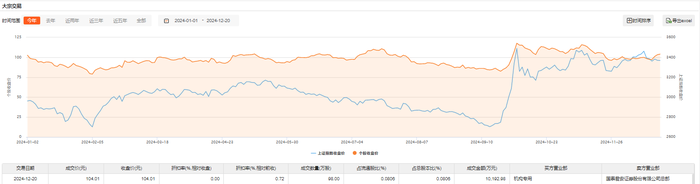 今日大宗交易成交98万股,成交额1.02亿元,占当日总成交额的3.48%,成交价104.01元,较市场收盘价持平。