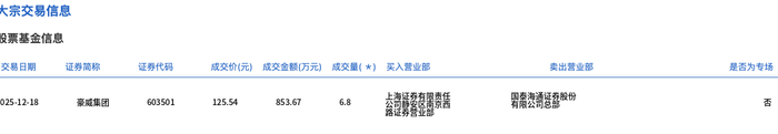 12月18日,豪威集团大宗交易成交6.8万股,成交额853.67万元,占当日总成交额的0.5%,成交价125.54元,较市场收盘价123元溢价2.07%。