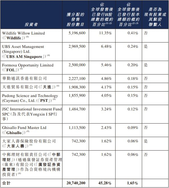 豪威集团本次发行的基石投资者为Wildlife Willow Limited(「Wildlife」)、UBS Asset Management(Singapore) Ltd.(「UBS AM Singapore」)、Formosa Opportunity Limited(「FOL」)、华勤通讯香港有限公司、Pudong Science and Technology(Cayman) Co., Ltd.(「PST」)、JSC International Investment Fund SPC(为及代表Yongxin I SP行事)、Ghisallo Fund Master Ltd(「Ghisallo」)、大家人寿保险股份有限公司(「大家人寿」)、中邮理财有限责任公司(「中邮理财」)(通过广发证券资产管理(广东)有限公司(「广发证券资产管理」)作为合资格境内机构投资者)。