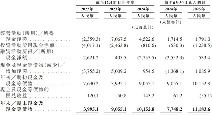 于2022年,豪威集团经营活动所用现金净额为人民币2,359.3百万元;于2023年、2024年以及截至2025年6月30日止六个月,豪威集团经营活动所得现金净额分别为人民币7,067.5百万元、人民币4,522.6百万元及人民币1,791,0百万元。