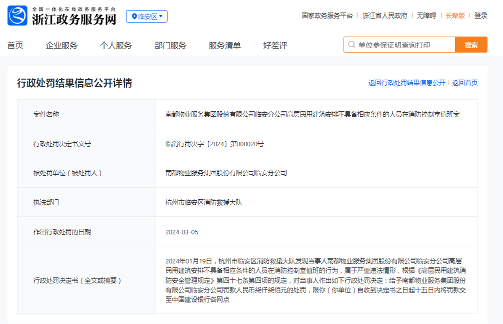 南都物业服务集团股份有限公司临安分公司高层民用建筑安排不具备相应条件的人员在消防控制室值班案
