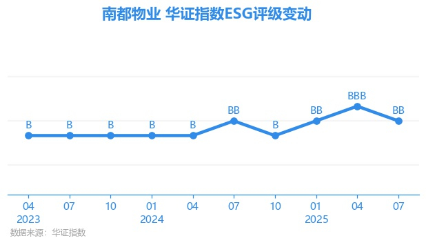 日前,华证指数公布了新一期(2025年7月31日)的ESG评级结果,南都物业(603506.SH)获得BB评级(华证指数评级为C起至AAA九档,C为最低档,AAA为其最高一级评级/AA为其第二档),上一期(2025年4月30日)ESG评级为BBB。本期ESG评级在102家房地产管理和开发行业A股上市公司中排名第37(上一期排名第37)。