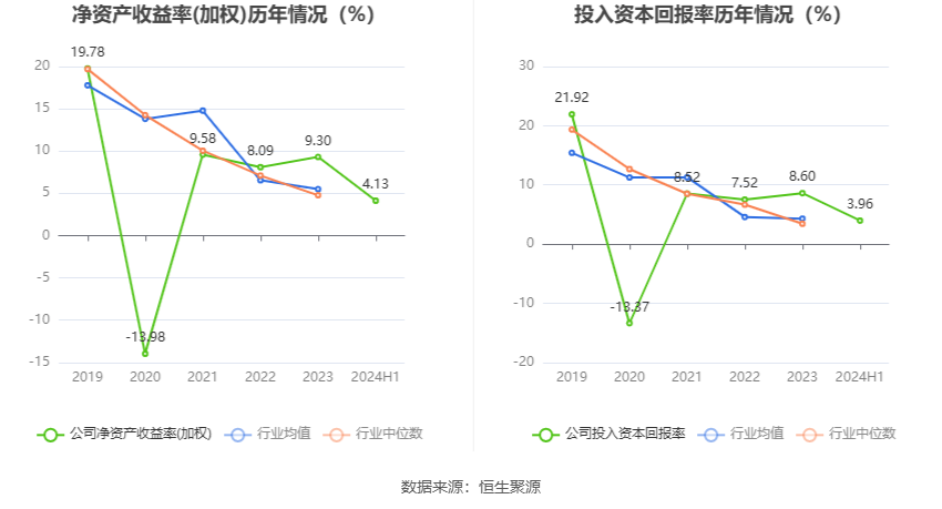 数据显示,2024年上半年公司加权平均净资产收益率为4.13%,较上年同期增长0.18个百分点;公司2024年上半年投入资本回报率为3.96%,较上年同期增长0.27个百分点。