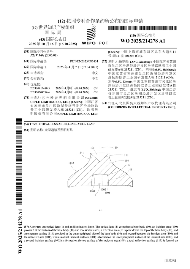 欧普照明公布国际专利申请:“光学透镜及照明灯具”