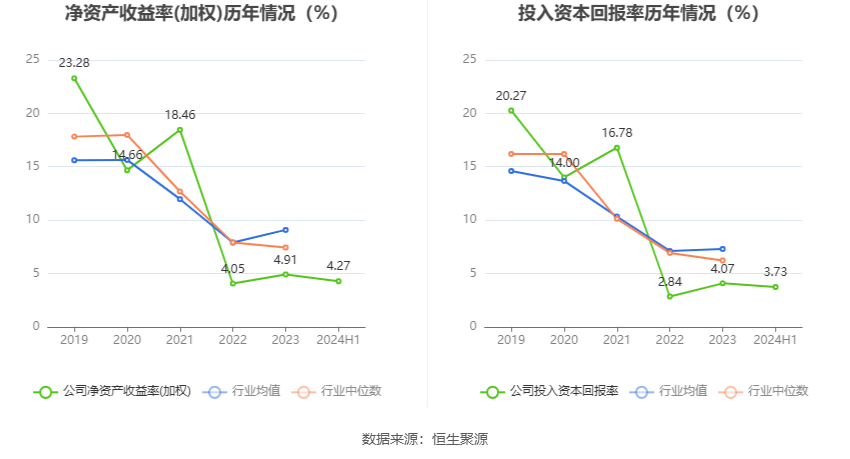 数据显示,2024年上半年公司加权平均净资产收益率为4.27%,较上年同期增长0.83个百分点;公司2024年上半年投入资本回报率为3.73%,较上年同期增长0.79个百分点。