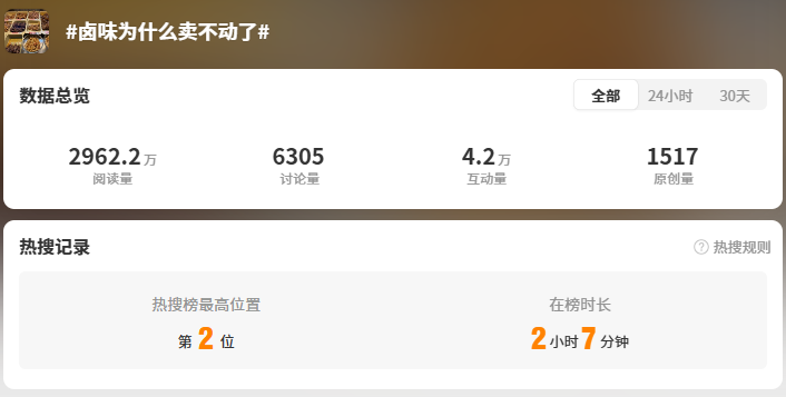 9月6日早间,话题#卤味为什么卖不动了#冲至热搜第二位,引发广泛关注与讨论。据《南方都市报》报道,今年上半年,三大休闲卤制品上市公司齐齐关店,营收均出现下跌,仅绝味食品净利润增长。比起年初,绝味食品(603517.SH)在内地的门店总数减少了981家,煌上煌(002695.SZ)净减少门店445家,周黑鸭(1458.HK)净减少门店360家。