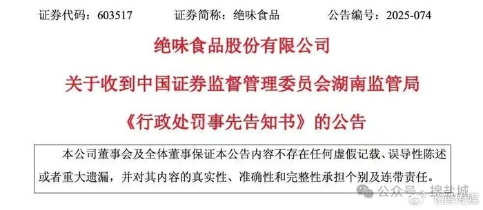 湖南证监局查实,绝味食品在2017年至2021年期间,未确认加盟门店装修业务收入,导致年报少计营收。少计比例最高达5.48%(2017年),虽逐年下降,但连续五年存在系统性财务指标虚假记载。公司被处以400万元罚款,实控人戴文军等高管合计被罚450万元,总计850万元。股票自9月23日起变更为“ST绝味”,进入风险警示板交易。