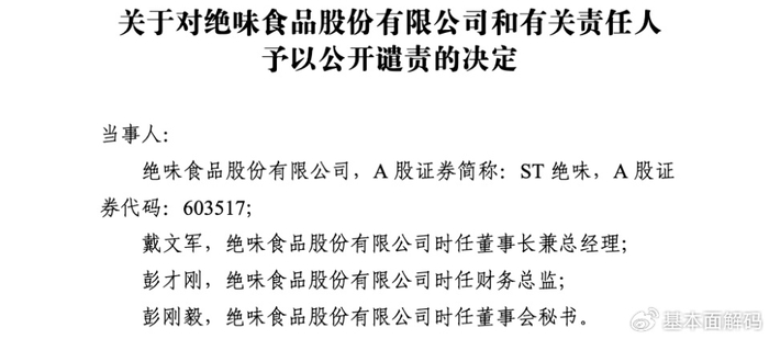 《处分决定》基于《上市规则2020》第16.2条、第16.3条、第16.4条、《上市规则2022》第13.2.1条、第13.2.3条、《上海证券交易所纪律处分和监管措施实施办法》及《上市公司自律监管指引第10号——纪律处分实施标准》,对绝味食品、戴文军、彭才刚、彭刚毅予以公开谴责。处分将通报中国证监会和湖南省地方金融管理局,记入证券期货市场诚信档案数据库。不服者可在15个交易日内申请复核,但执行不停止。
