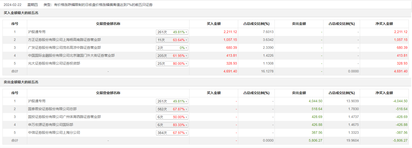 具体来看,沪股通专用、方正证券上海杨高南路证券营业部分别买入2211.12万元、1057.15万元;沪股通专用、国泰君安证券总部分别卖出4044.50万元、518.64万元。