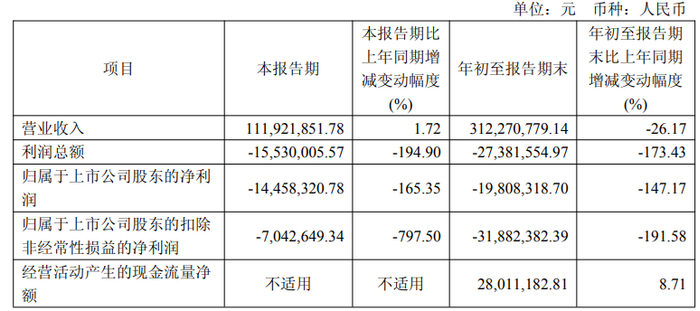 报告显示,多伦科技公司前三季度营业收入为3.12亿元,同比下降26.17%;归母净利润为-1980.83万元,同比下降147.17%;扣非归母净利润为-3188.24万元,同比下降191.58%;基本每股收益-0.03元。