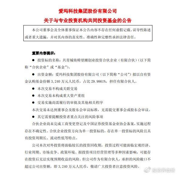 投资界(ID:pedaily2012)10月30日消息,近日,爱玛科技集团股份有限公司发布关于与专业投资机构共同投资基金的公告,宣布拟以自有资金认购基金份额 3,240 万元人民币,共青城倚樟望潮创业投资合伙企业(有限合伙)(以下简称“合伙企业”或“基金”),占比 29.9861%,担任有限合伙人。